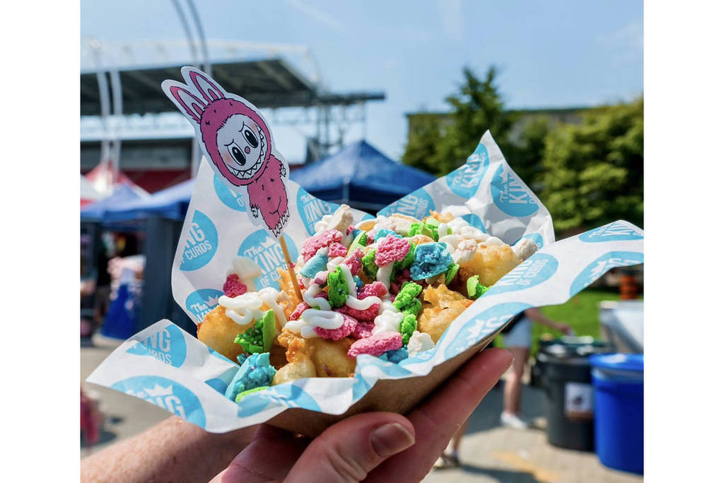 Le fromage en grains frit et gluant est garni de miettes de macaron, de crème au beurre et de paillettes comestibles, inspiré de la tendance virale des jouets Labubu. Vous les trouverez chez King of Curds.