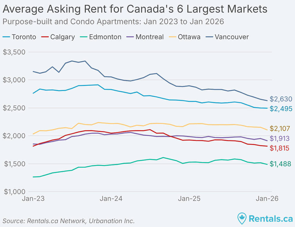 D’après un nouveau rapport de Rentals.ca et Urbanation, le loyer moyen demandé dans la ville a chuté à des niveaux jamais vus depuis début 2022. Après des années de hausse vertigineuse des coûts qui ont poussé de nombreux habitants à quitter la ville, le marché connaît enfin un changement de cap important.