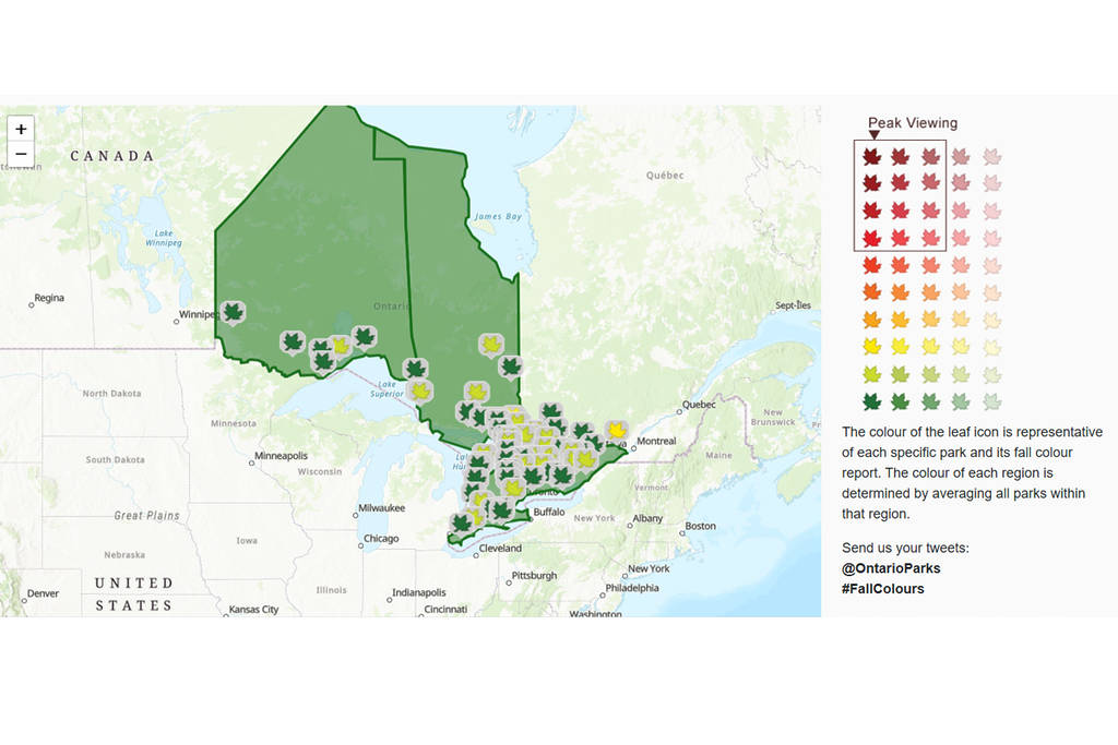 The report is updated regularly throughout the season, displaying an interactive map with colour-coded leaf icons which lets you see the current colour change in Ontario’s provincial parks.