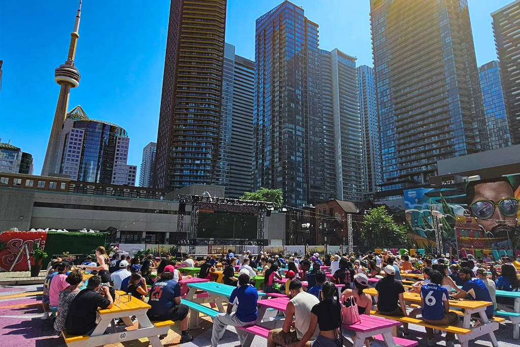 Toronto’s biggest outdoor patio becomes full playoff mode for the Jays. A massive screen, stadium-quality sound, beer buckets, cocktails, fire pits, and a party atmosphere are what you can count on at RendezViews. The venue opens at 7 p.m., with fire pits, snacks for purchase, and first-come seating for both Friday and Saturday’s 8 p.m. games.